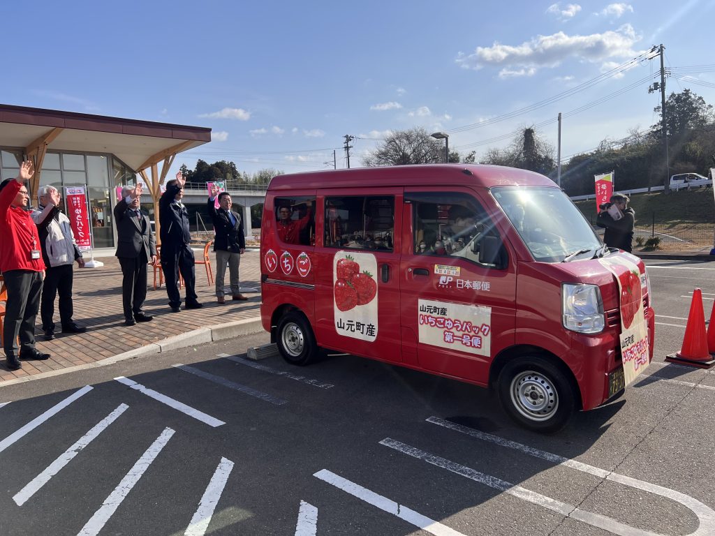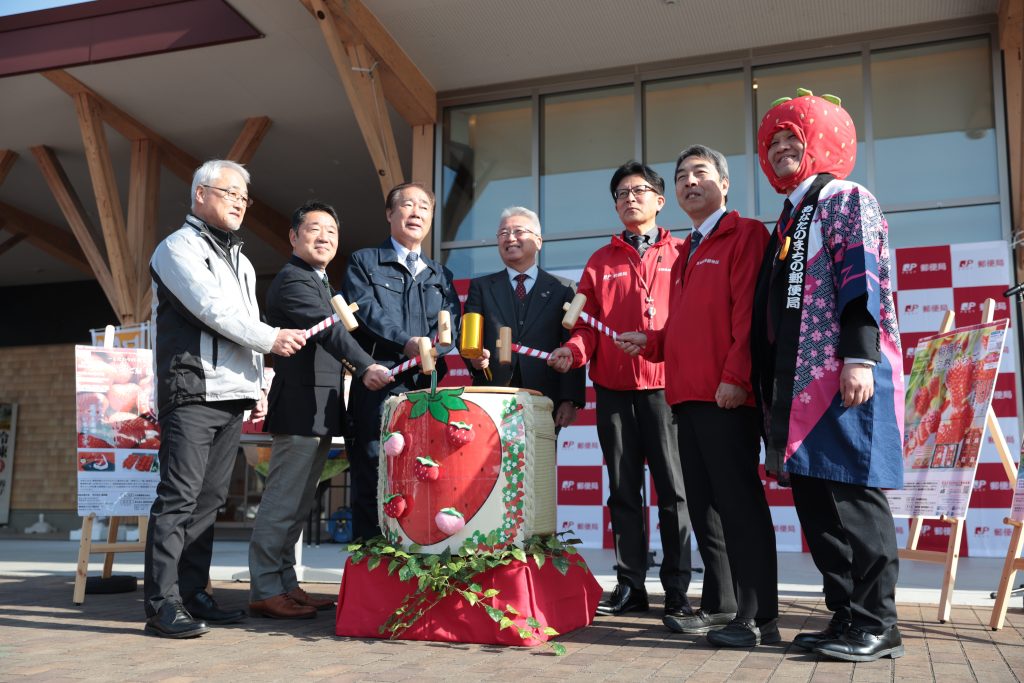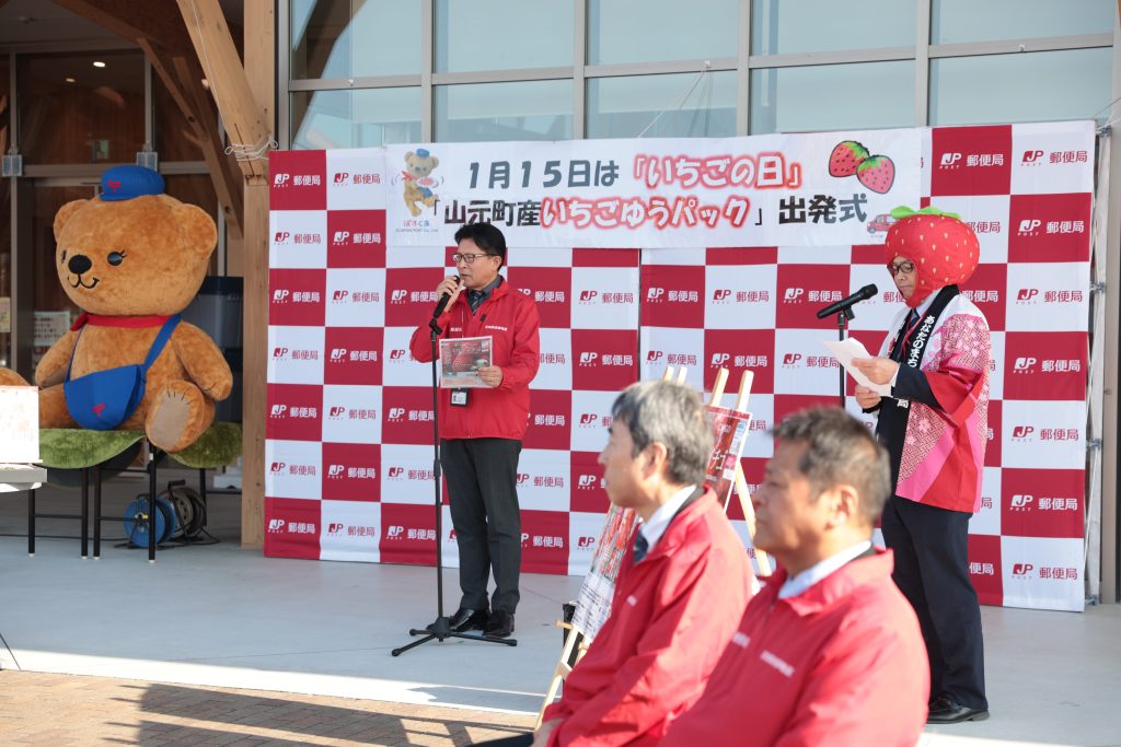 本出発式は、丹精込めて育てられた「ミガキイチゴ」をはじめとする山元町産のいちごを全国へお届けし、復興の歩みと地域の笑顔を発信したいという日本郵便株式会社の想いのもと開催するものです。